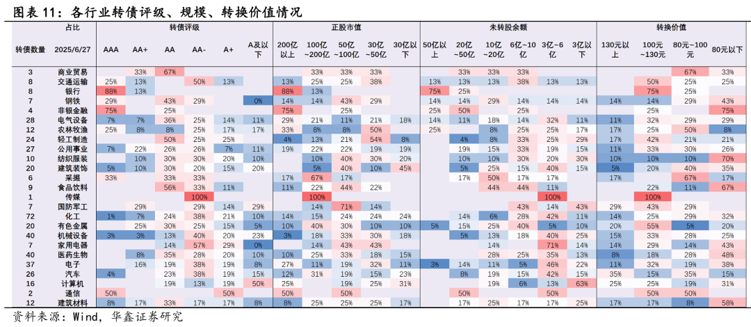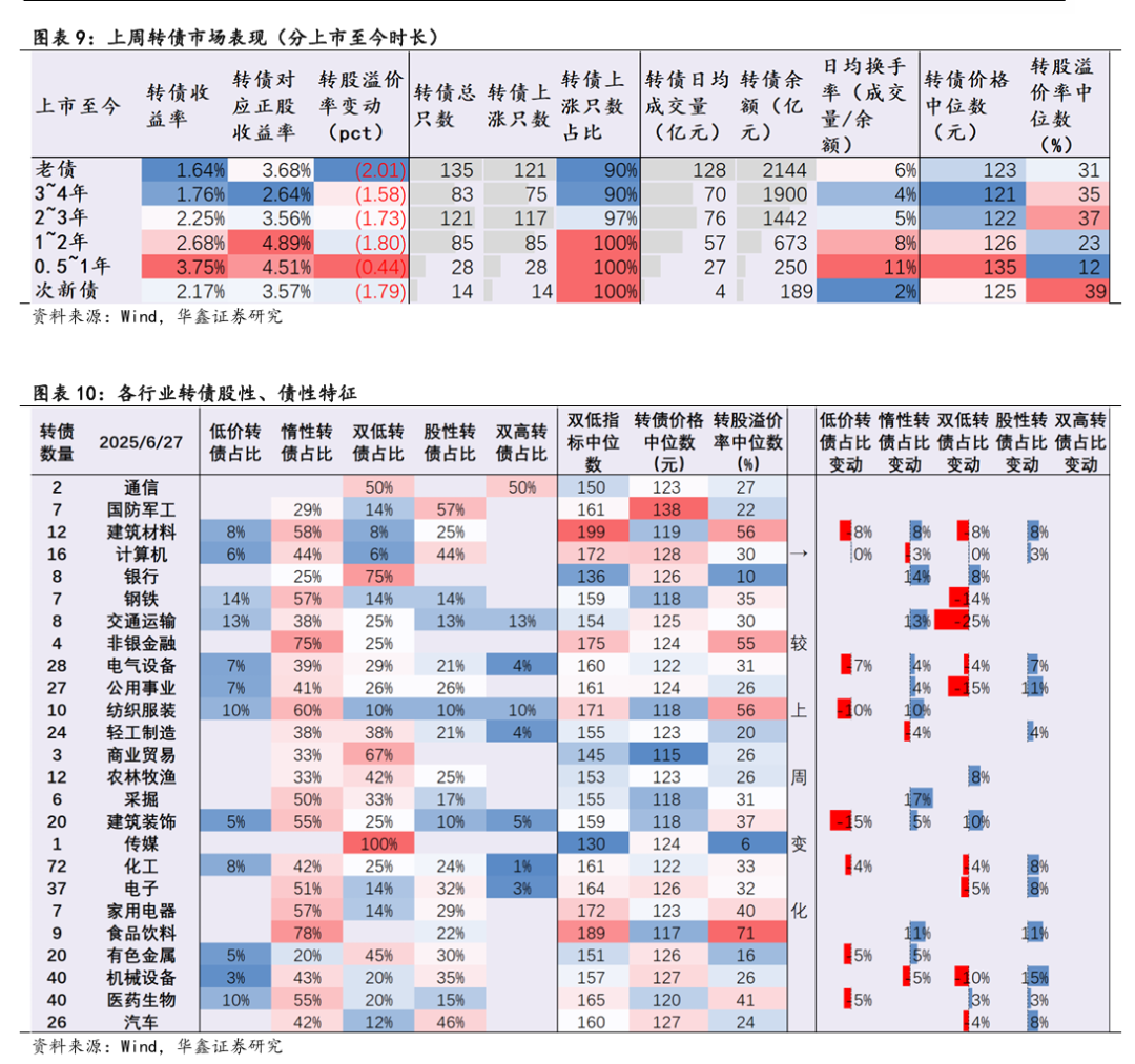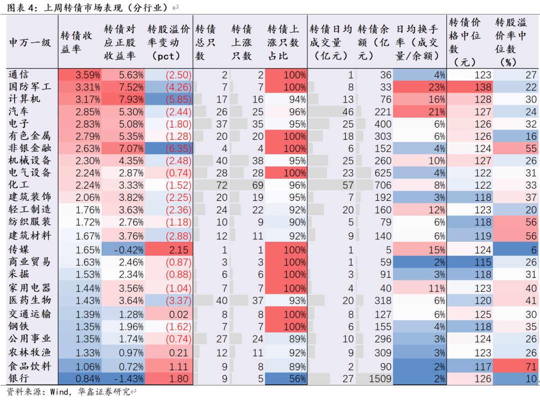上周正股走强、转债估值在固收+资金刚性需求撑抓下抓续高位颤动、光伏品种开导等身分导致中证转债指数打破前高。现在转债性价比受限,一方面,转债全市集价钱中位数栽种至123元。另一方面估值抓续处于偏高水平,择券空间缩窄,合座上以估值有待转机的惰性转债占比最大,且其占比进一步提高。上盘活股溢价率中位数由32.5%下降至30.8%(历史分位63%),隐含波动率由27.1%栽种至29.6%(历史分位63%),隐波差中位数由-17%栽种至-15%(历史分位36%)。上周部分行业转债出现估值的主动栽种甚而正股跌而转债涨,如银行、食物、农业、走运、传媒。现在择券空间较大的行业有银行、有色、汽车、生意贸易等,以弹性较好的双低和股性转债居多。